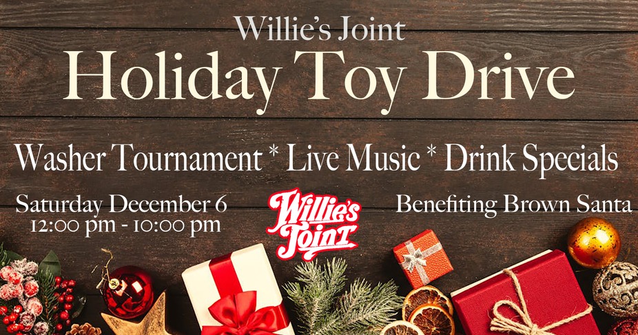 Benefiting Brown Santa Live Music from Rochelle & The Sidewinders. Washer Tournament. $40 entry fee plus a new unwrapped toy. Cash Prizes Double elimination tournament. Help us break the toy record again. Asking for NEW UNWRAPPED toys or cash donations at the door. We will have football on all day long as well.
