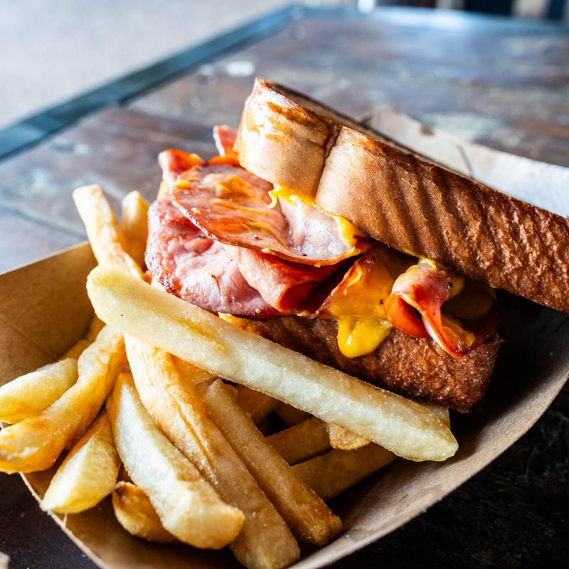 Thin-cut ham and gooey melted cheese grilled between buttery Texas toast.