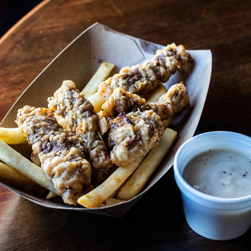 Five strips of breaded steak, deep-fried and served with cream gravy.